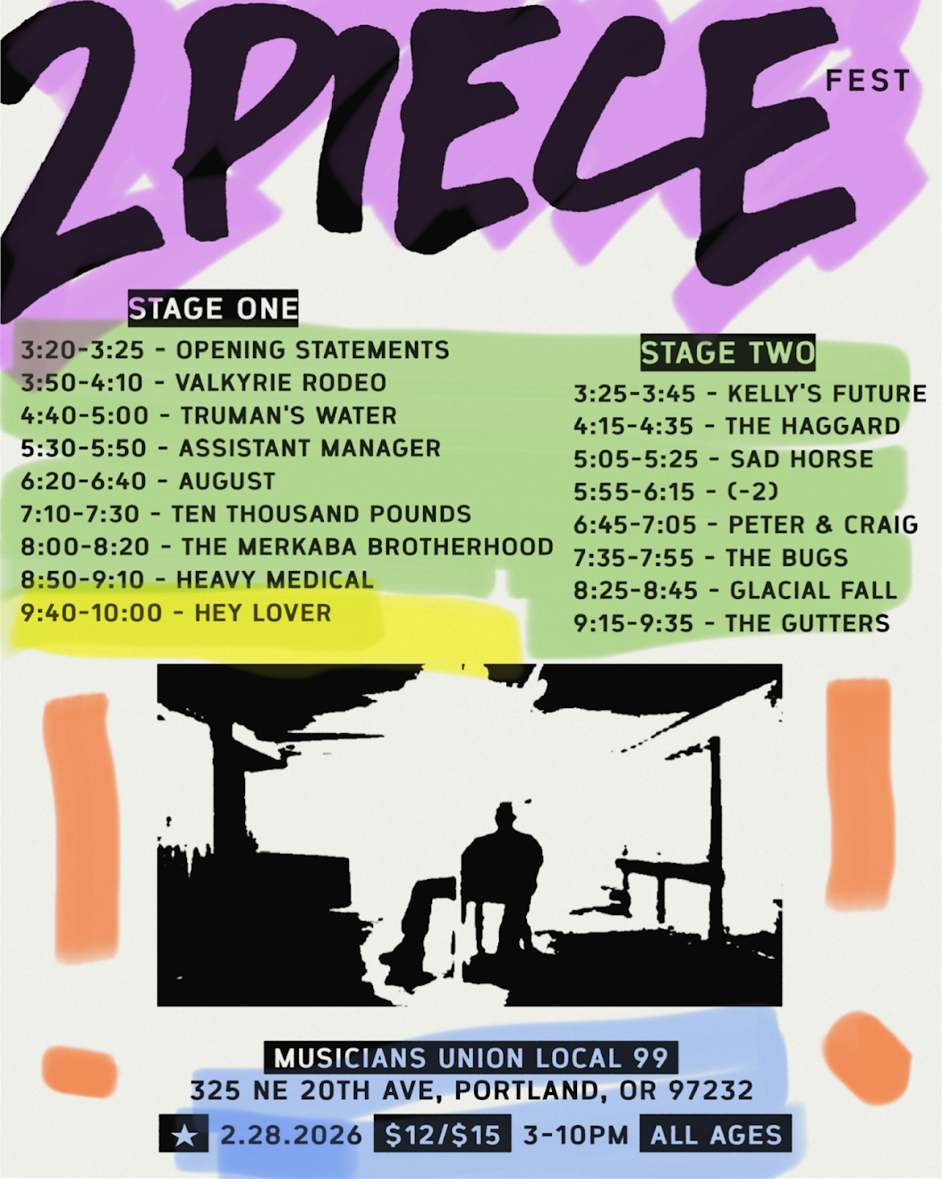 PORTLAND MERCURY on Two-piece fest has been celebrating musical duos since its 2008 beginnings in Philadelphia. This year, the organization expands to Portland with an all-ages show where two dollars of your ticket price goes to the Portland Immigrant Rights Coalition. With performances from 16 different two-piece acts, I can't imagine a more fitting way to spend the last day of the second month of the year. I'm looking forward to sets from husband-and-wife budget punks Hey Lover, DIY garage rockers the Bugs, and sax-and-drum pair (-2)—pronounced "minus two." Don't have a plus one? That's fine, the only groups that are required to be duos are those onstage. |